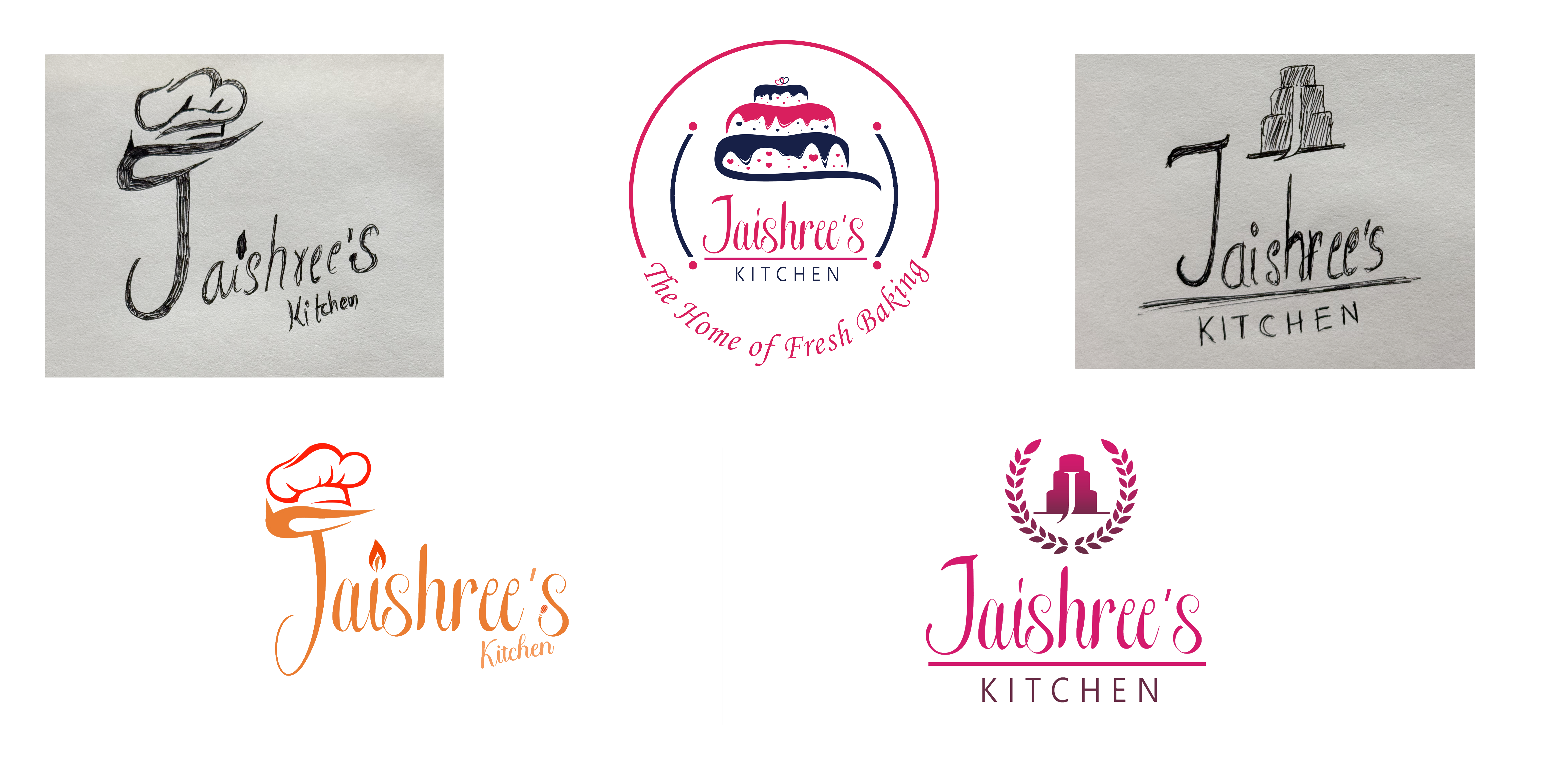 These rough sketches represent the initial conceptualization of the Jaishree's Kitchen logo, exploring various visual elements that capture the essence of homemade baking. The hand-drawn designs experiment with typography and key symbols like a chef’s hat and layered cakes, emphasizing themes of professionalism, warmth, and celebration. The sketches helped refine the brand’s identity by focusing on elegant lettering and recognizable baking-related imagery. As the designs evolved into digital formats, elements such as color psychology and polished typography were incorporated, ensuring versatility and visual appeal. This process highlights the importance of sketching as a foundational step in crafting a strong and cohesive brand identity.