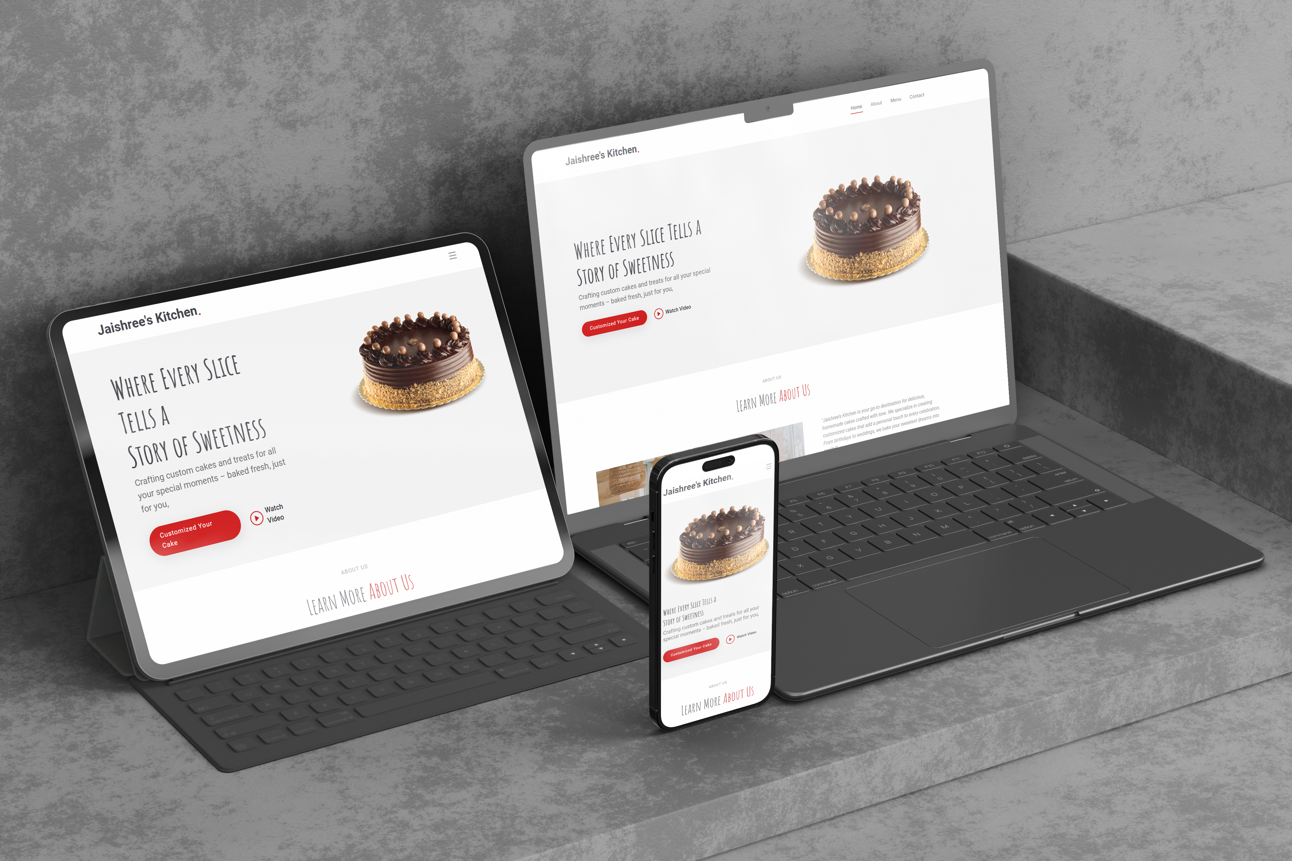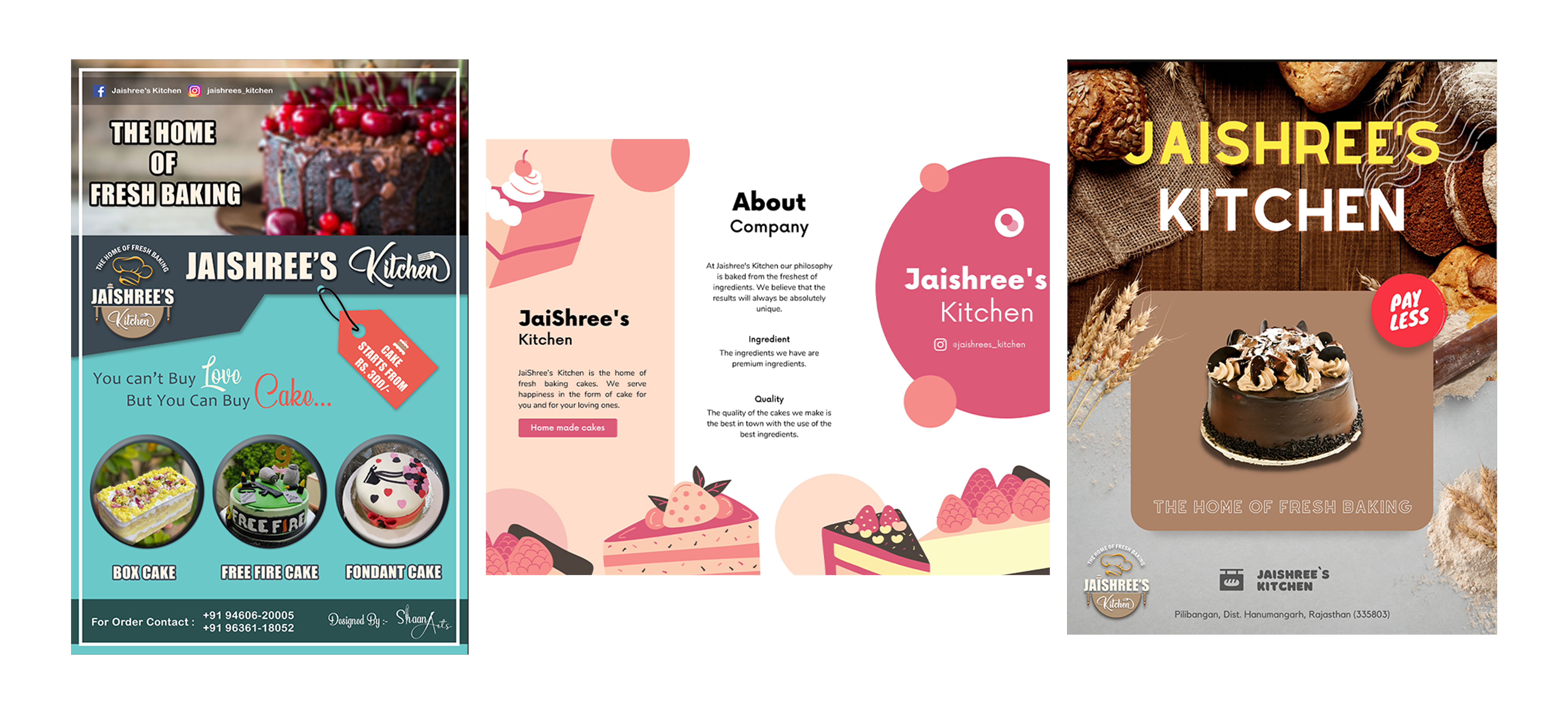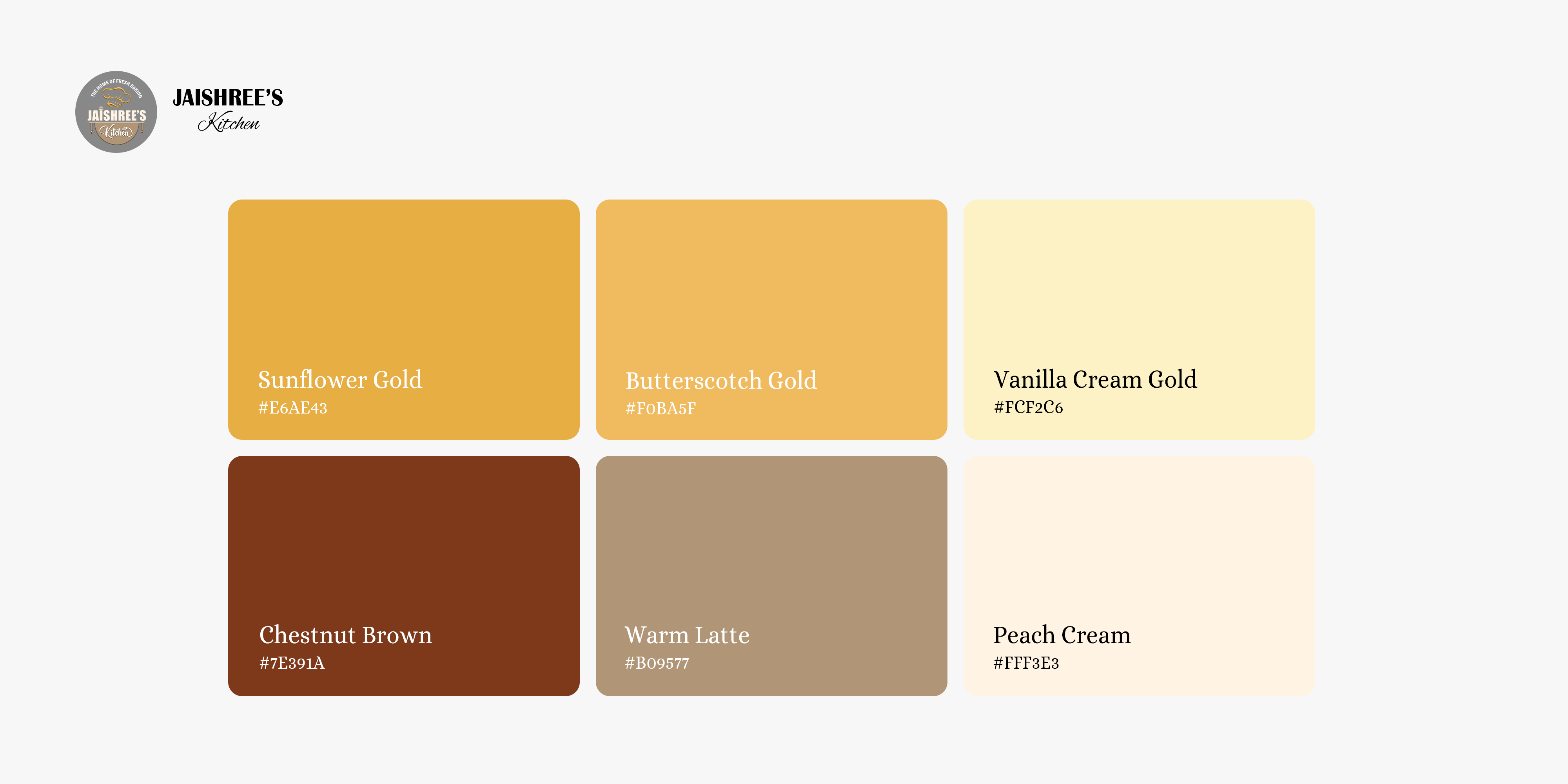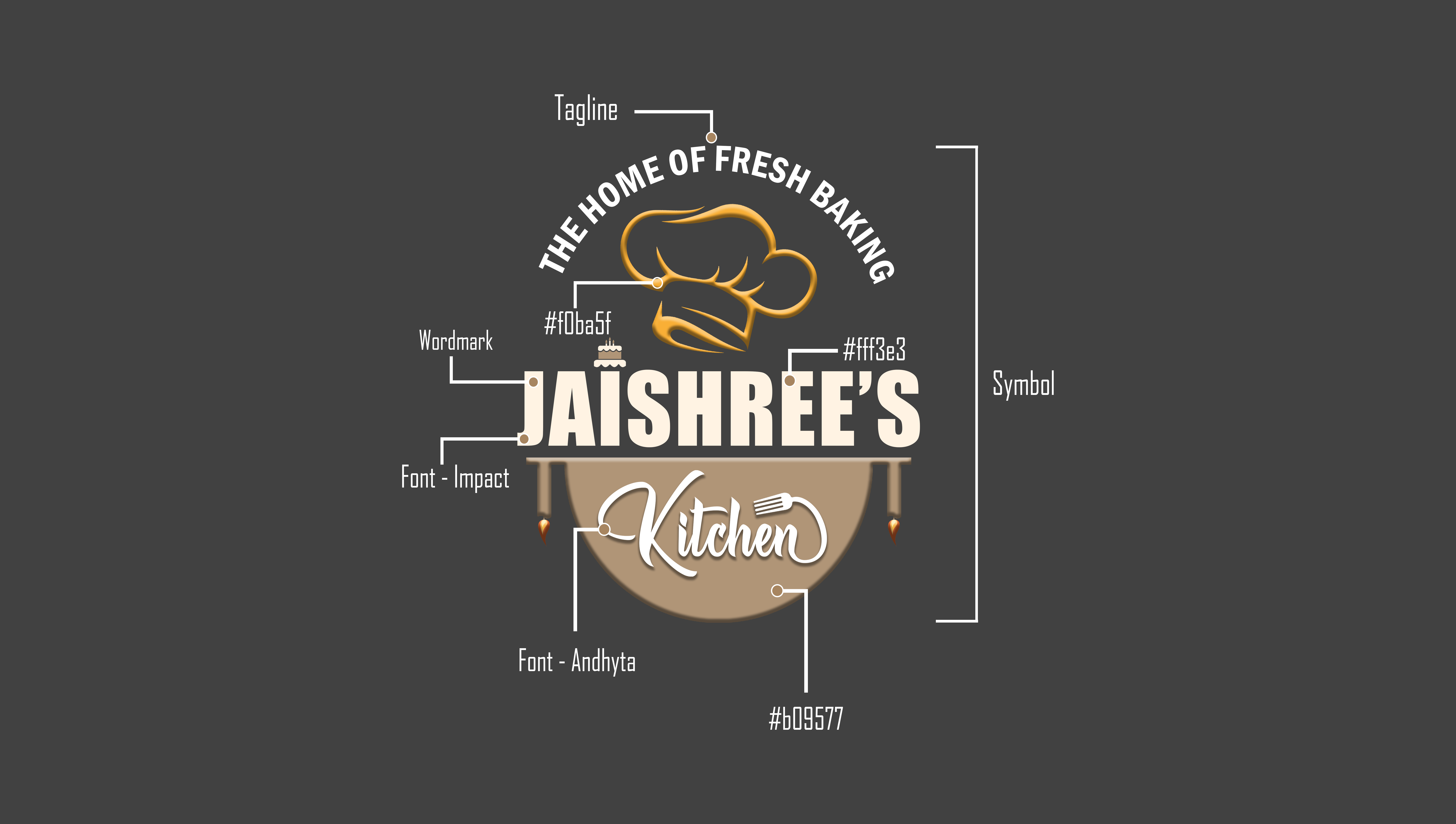 The selection of Impact, Andhyta, and Franklin Gothic Demi Condensed for Jaishree's Kitchen perfectly captures the brand’s essence—bold, artistic, and inviting. Impact, used for "JAISHREE'S," exudes confidence and reliability with its strong, heavy-weight structure, symbolizing the brand’s prominence in homemade baking. Andhyta, featured in "Kitchen," adds an elegant, handwritten flair, reflecting the artistry and warmth of Jaishree's Kitchen while emphasizing the handcrafted nature of their bespoke cakes and cupcakes. Franklin Gothic Demi Condensed, used for the tagline, provides a clean, professional touch, ensuring readability and adding a refined contrast to the other fonts. Together, these typefaces harmonize tradition with creativity, making Jaishree’s Kitchen a brand that stands out while feeling personal and welcoming.